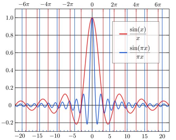 函数的图像如下所示,当 x 趋向于 0 时,因为 sin(x) 与 x 的速度等同,它们相除最终会收敛到 1。之所以要构造这个函数,答案就藏在它的零点,即当 sinc(πx) = 0 时 x 的所有取值。