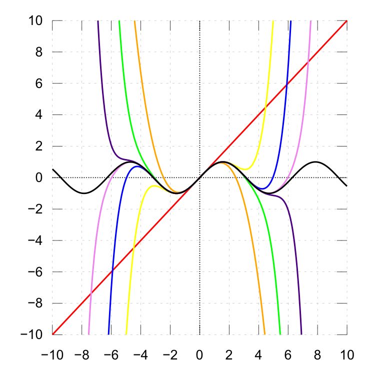 图 6. 当泰勒级数的数目不断增加,它最终将收敛于其表示的那个函数。图中黑色曲线代表 sin(x) 函数。其他曲线为其对应不同阶次的泰勒展开式,也就是最高次幂分别为 1,3,5,7,9,11 和 13 的多项式。