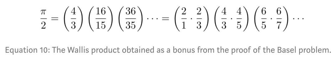 不仅如此,欧拉的推导过程产生了著名的 Wallis 乘积公式。仅需将 x = 1/2 代入式 6 并求其倒数即可得到: