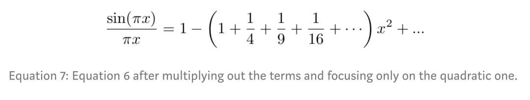 通过联立式 7 和式 9 sinc(x) 展开后的二次项系数,即可得到我们最初想要解决的巴塞尔问题: