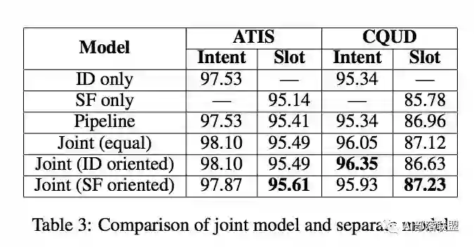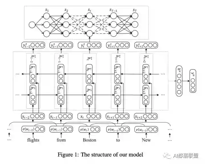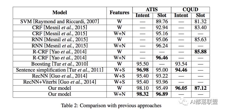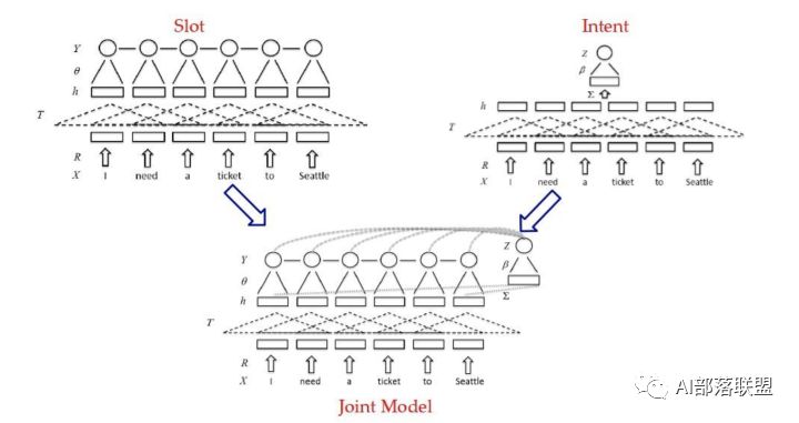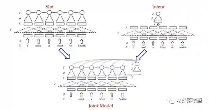 这篇工作在ATIS数据集把意图识别跟槽填充联合起来做的,主要方法是CNN+ triangular CRF,意图识别的准确率为94.09%、槽填充的F1为95.42%,可以看出比起前面基于CRF的模型效果好不少。 triangular-CRF与CRF的主要区别是输入前先用前向网络得到每个标签的类别。