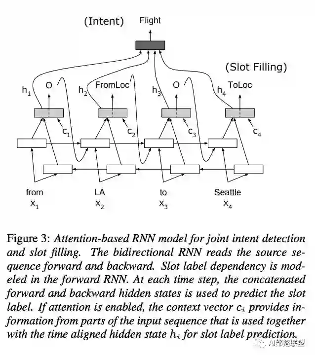 这篇工作是基于Attention的RNN,把意图识别与槽填充结合起来做,其实在上面RNN(encoder-decoder)的方法中已经介绍过这个方法。为了跟上一种方法对比,需要注意的是,意图分类和槽填充不在同一个序列完成,decoder的隐层输出加权得到最后的意图分类,BiRNN得到特征并与文本向量拼接后作为单层decoder的输入,然后识别槽位。