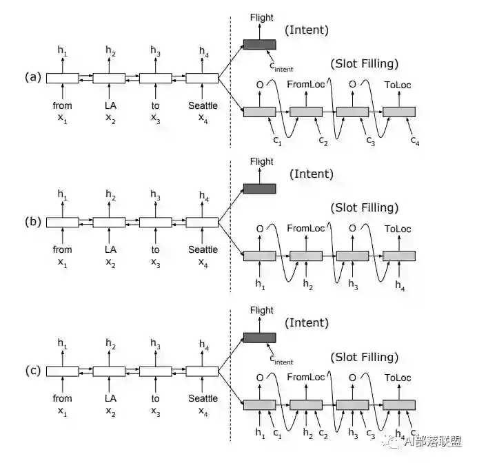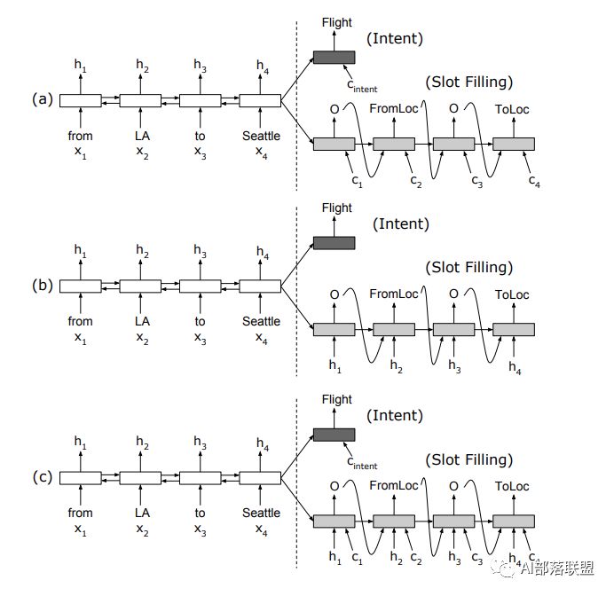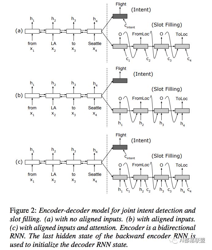 采用encoder-decoder,encoder的最后输出+文本向量做意图分类。下面说下a、b、c三图的区别:图a隐层为非对齐attention的模型,decoder隐层为非对齐的方式;图b为隐层为对齐无attention的模型;图c隐层为对齐attention的模型。