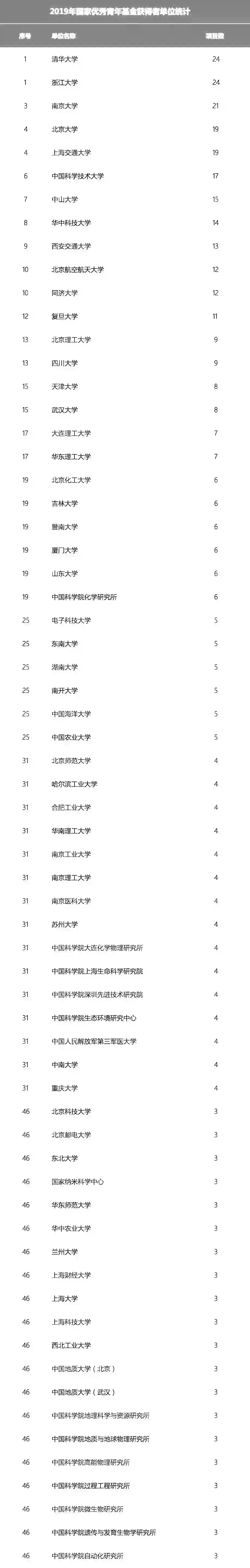优青项目方面,清华大学和浙江大学各有24人获得资助,并列第一。排名第三的是南京大学,共有21人。北京大学和上海交通大学各有19人,并列第四位。