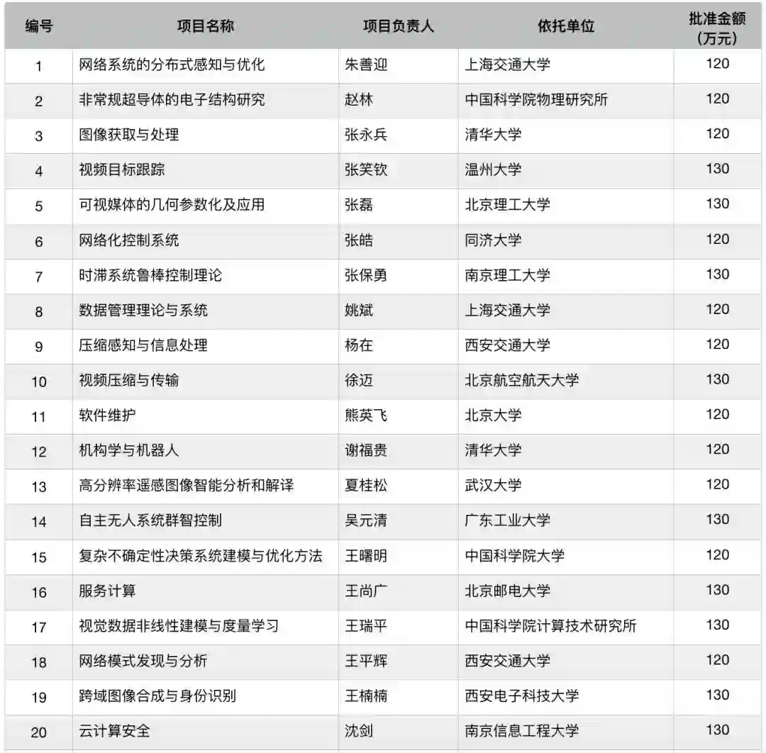 新智元也盘点了计算机、物联网、电子工程等相关的项目,南大周志华教授、东南大学孙长银教授、北京邮电大学马华东教授等获得创新研究群体项目资助。
