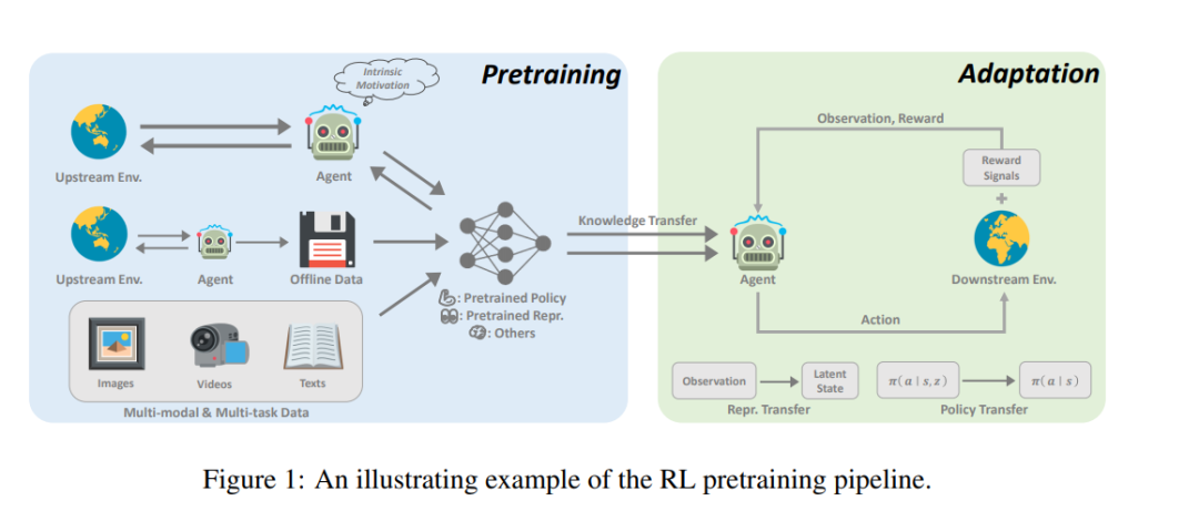然而,其他机器学习领域的最新进展积极倡导利用从大规模预训练中构建的先验知识。大型通用模型,也被称为基础模型(Bommasani et al., 2021),通过在大范围数据上进行训练,可以快速适应各种下游任务。这种训练前-微调范式已被证明在计算机视觉等领域有效(Chen et al., 2020; He et al., 2020; Grill et al., 2020)和自然语言处理(Devlin et al., 2019; Brown et al., 2020)。然而,预训练还没有对RL领域产生显著影响。尽管如此,大规模RL前训练的设计原则面临着来自多方面的挑战: 1) 领域和任务的多样性; 2)数据来源有限; 3) 快速适应解决下游任务的难度大。这些因素源于RL的性质,不可避免地需要加以考虑。