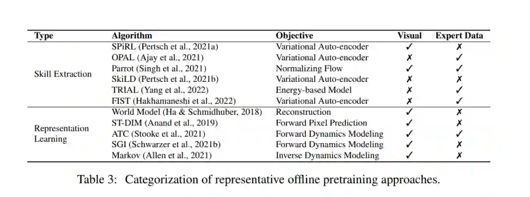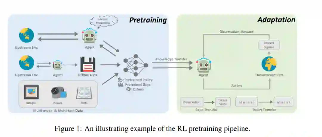 近年来,深度RL的预训练取得了一些突破。在著名的AlphaGo中,通过专家演示,使用监督学习来预测专家采取的行动,进行了朴素的预训练(Silver et al., 2016)。为了在较少的监督下进行大规模的预训练,无监督强化学习领域近年来发展迅速(Burda等人,2019a;Laskin等人,2021),使智能体能够在没有奖励信号的情况下从与环境的交互中学习。根据离线RL的最新进展(Levine等人,2020年),研究人员进一步考虑如何利用未标记和次优离线数据进行预训练(Stooke等人,2021年;Schwarzer等人,2021b),我们称之为离线预训练。与任务无关的数据的离线范式进一步为通用预训练铺平了道路,其中来自不同任务和模式的不同数据集以及具有良好扩展特性的通用模型被组合起来构建通用模型(Reed et al., 2022; Lee et al., 2022)。预训练有可能在强化学习中发挥重要作用,这项综述可以作为对该方向感兴趣的人的起点。在这篇论文中,我们试图提供一个系统的回顾,现有的工作在深度强化学习的预训练。据我们所知,这是系统研究深度RL预训练的先驱努力之一。