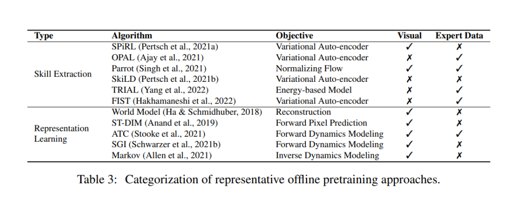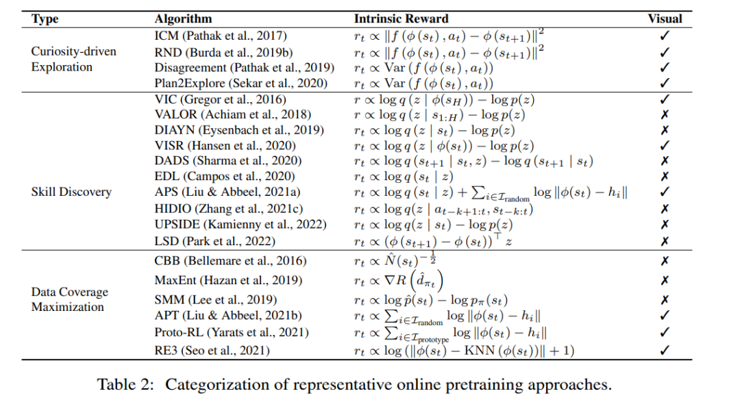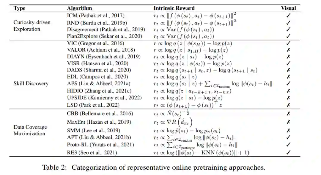 没有这些奖励信号的在线预训练可能是学习通用技能的一个很好的解决方案,并消除了监督要求。在线预训练的目的是在没有人为监督的情况下,通过与环境的交互获得先验知识。在预训练阶段,允许代理与环境进行长时间的交互,而不获得外部奖励。当环境是可访问的,使用它可以促进技能学习,当任务被分配给智能体时,这些技能将非常有用。这种解决方案,也被称为无监督RL,近年来得到了积极的研究(Burda等人,2019a;Srinivas & Abbeel, 2021年)。