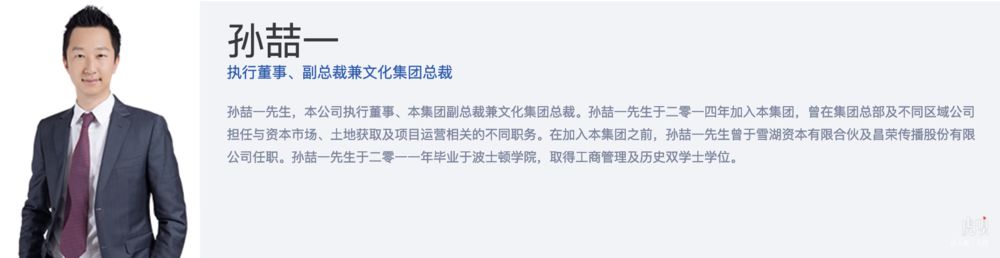 融创中国官网显示,孙宏斌长子孙喆一担任融创集团旗下融创文化集团的总裁一职。目前,孙喆一的职务已被更新为“执行董事、副总裁兼文化集团总裁”。公开资料显示,孙喆一现年29岁。