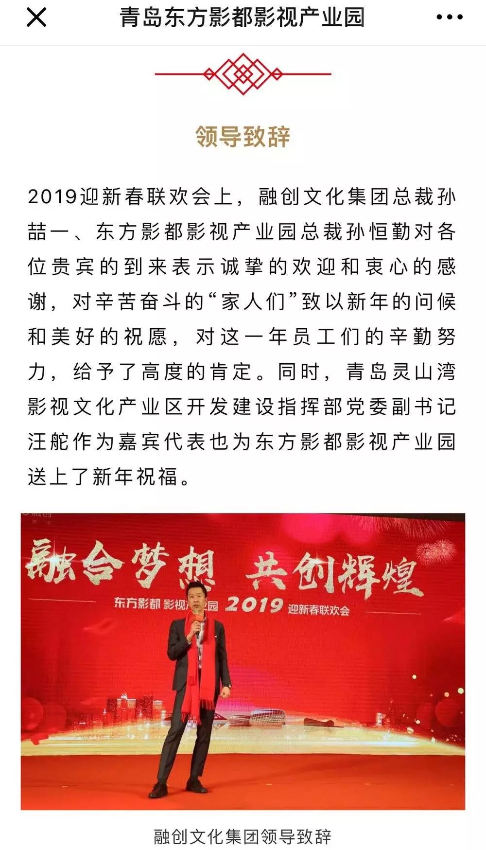 融创于前两年收购的乐视影业(现乐创文娱)以及原万达旗下的青岛东方影都影视产业园均属于融创文化集团。融创文化将与融创地产、融创物业服务、融创文旅一起组成融创中国四大战略板块。低调的孙喆一最近一次露面就是在青岛东方影都的“迎春联欢会”上。