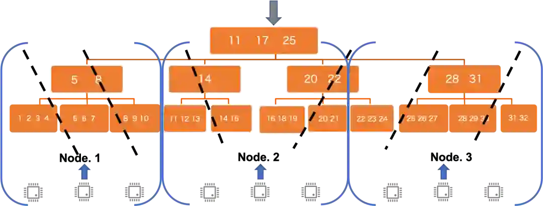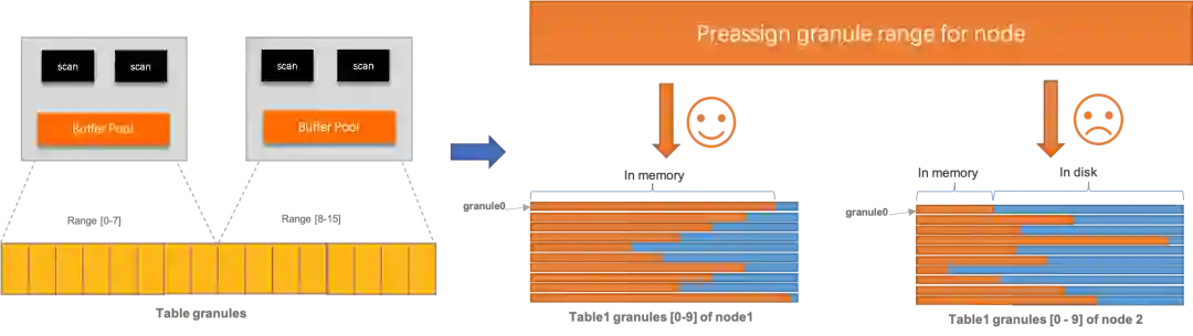 对于切分出的所有granules,预先按照参与查询的节点数分配为若干range区间,各个range内的granule连续排列。在实际执行中,每个节点内的所有worker线程利用所属migrant leader的共享计数器,争抢所分配range内的granules集合。