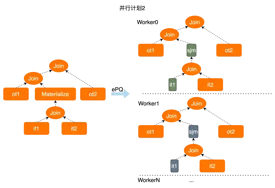 可以看到,每个worker都完成了it1和it2表的全量join和物化操作,这个重复的动作有可能代价很大,且没有必要,更有效的方法可能是这样: