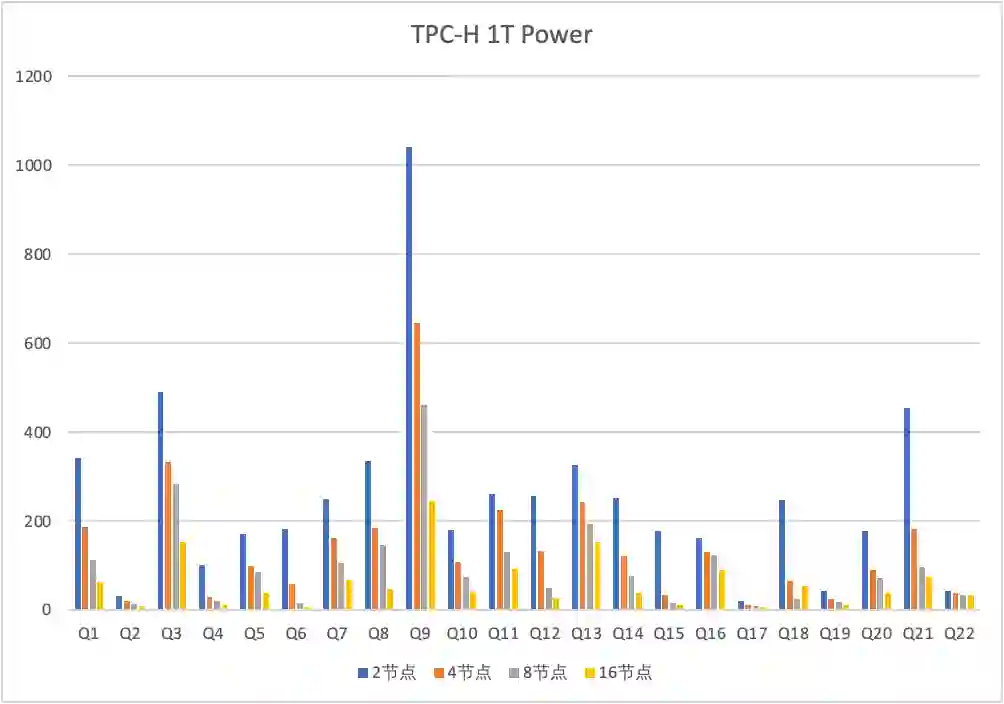 仍然使用TPC-H 1T做power run,也是从2节点开始依次翻倍