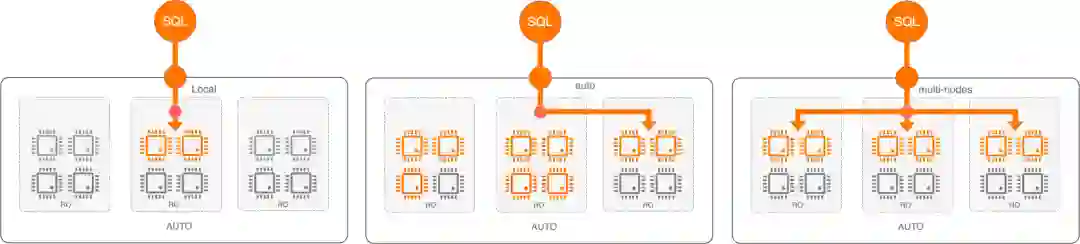 用户设置并行度为2,当开启AUTO模式时,如本地节点资源充足则选择本地执行 (上图左),否则会将worker协调到其它有空闲资源的节点(上图中)。当查询代价/扫描行数超过特定阈值且集群内有足够空闲资源,DoP弹性调整为2*3=6,使用集群内所有节点进行加速(上图右)