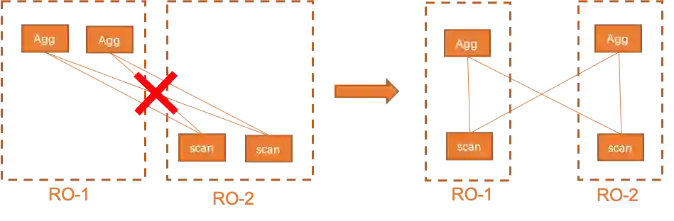 最小化跨机数据传输:针对非leaf workers生效,上层worker在分配时要参考下层worker尽量做"竖向"切分,减少跨机数据交互,例如下图左侧的数据分发总量会少于右侧