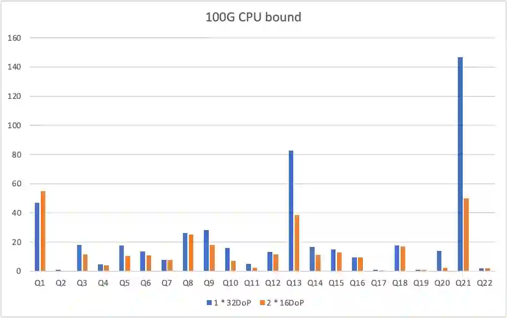 TPC-H 100G,22条查询每条执行3次取第3次结果,此时数据完全cache在实例内存中无IO,对比如下: