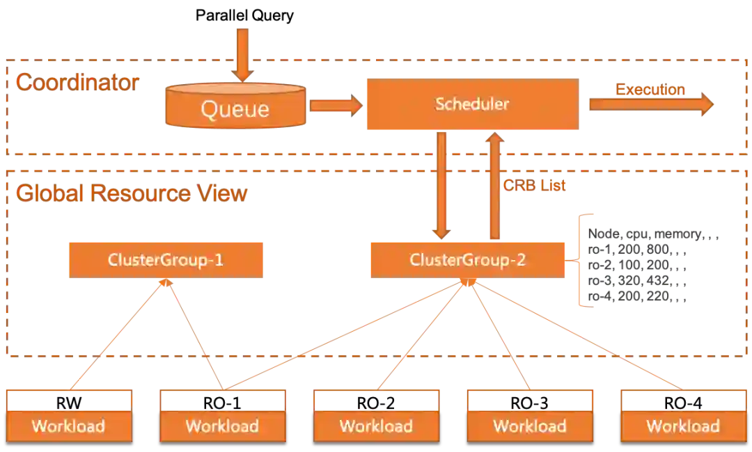 弹性多机并行除了具有前者利用多节点并行的加速能力外,更重要的是,它会实时监控集群内的拓扑变化和资源使用,从而实现随计算资源的变化动态适配并行策略,无论是单个节点的规格提升(scale up)、或是引入了新的RO节点(scale out),都可以自适应的做并行度调整和子任务分发,在避免单节点计算热点的同时、尽可能保证按照用户指定的并行度完成查询,从而达到更高的资源利用率。