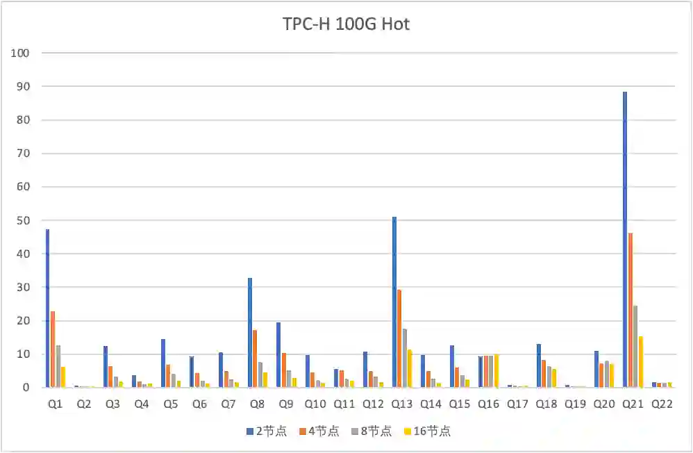 同样使用TPC-H 100G,22条查询每条跑3次取第3次结果,使用16c的polar.mysql.x8.2xlarge规格的节点,从2节点开始依次翻倍节点数