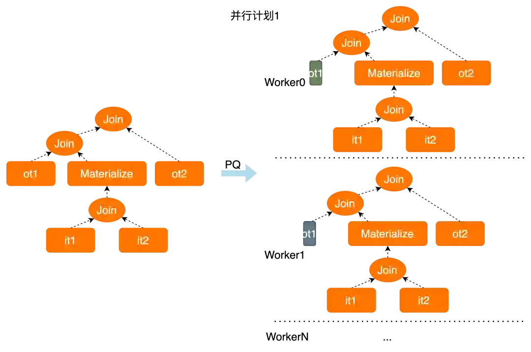 在单节点PQ2.0中,已经实现了全算子的并行执行支持,但少量算子仍不够完善,例如对于Semijoin Materialize这种执行方式,原有的并行策略是全量下推到worker中,这意味着每个worker都需要执行全部的semijoin物化操作,这明显不是最高效的。