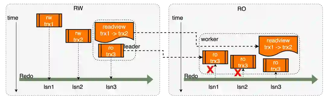 为了保证集群级别的事务一致性,RO节点必须能够感知到RW上发生的读写事务,并根据这些信息构建本地的活跃事务信息,来同步RW的事务系统状态,为此innodb层会将读写事务的相关信息写入redo log复制到RO,RO解析redo后重新构建活跃事务链表。