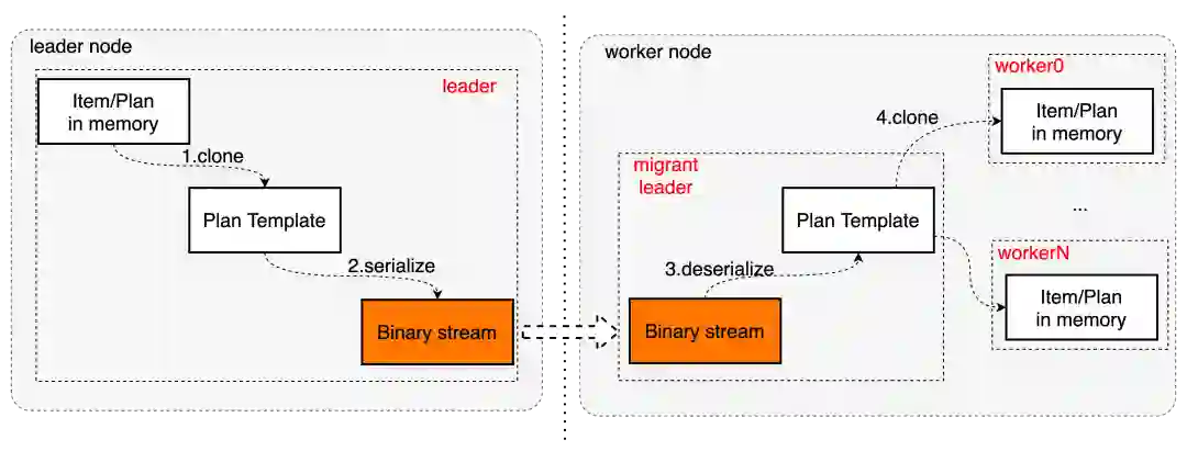在每个下发的子节点上建立一个migrant leader角色,该线程是节点上的代理,负责与leader的控制信令交互、生成计划模板和执行上下文等共享信息,同时也要负责创建worker、管理worker执行状态等,这个角色的计算量很小基本不占什么资源。通过这种方式,控制通道优化为1:node数。