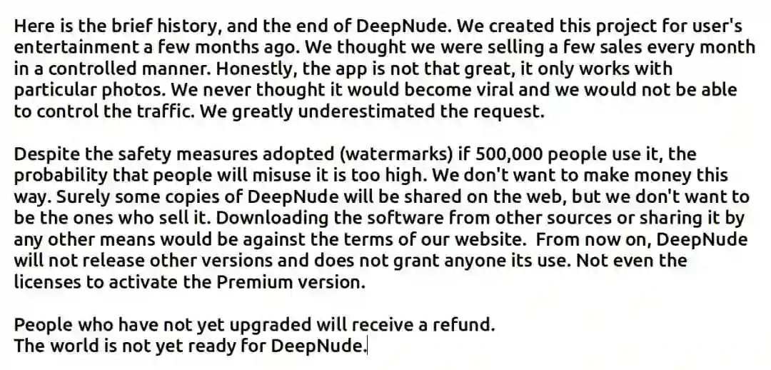 DeepNude APP 的开发者发出公告表示传播深度学习处理过的图片并不是开发软件的本意,而那些付费购买但还没来得及升级的用户将会收到退款。