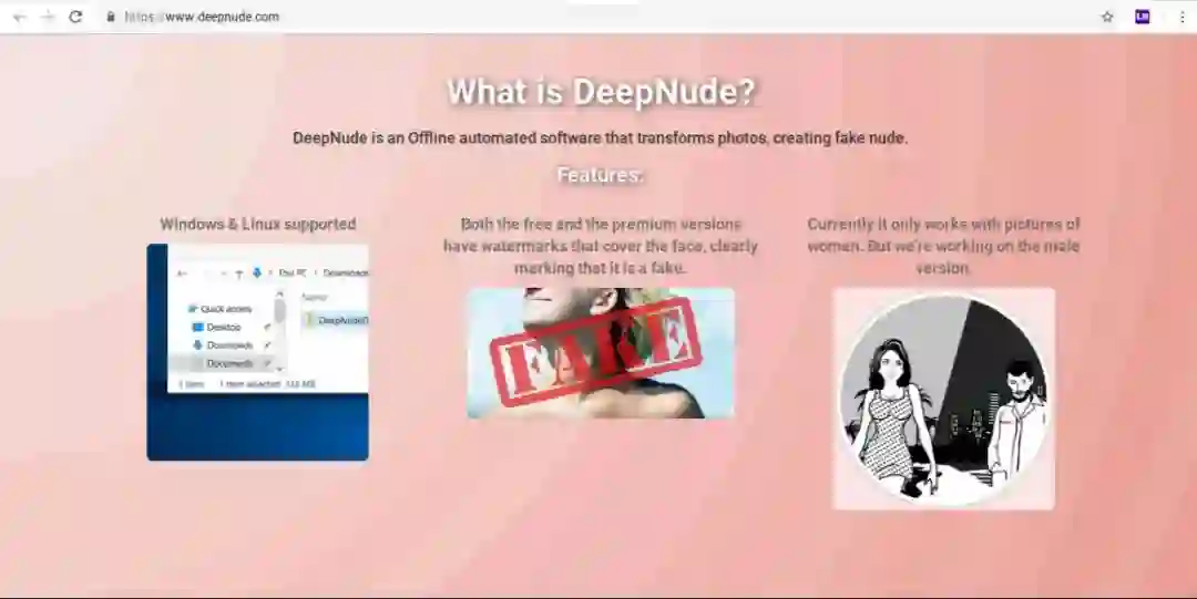本周四,DeepNude 已在官网上线,用户可在线上处理照片,同时可下载的 Windows 和 Linux 应用也在 6 月 23 日推出。这款 APP 有免费版和 50 美元付费版。使用免费版获得的图片会出现较大水印,付费版虽然不出现水印,但也会在图片左上角加上「FAKE」标签。
