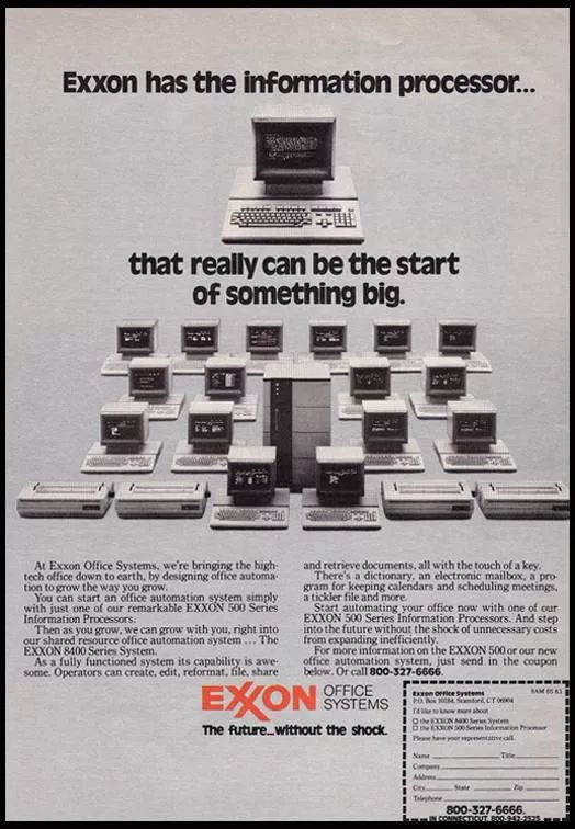 随后,埃克森在70年代共投资了37家公司,有一多半的公司都和埃克森的核心业务无关:例如测试评分机、高速打印机、缓解空气污染的技术公司、文本编辑机、手术设备、太阳能加热板、石墨复合高尔夫球杆杆和高级计算机等。(下图是埃克森在高科技行业的投资)