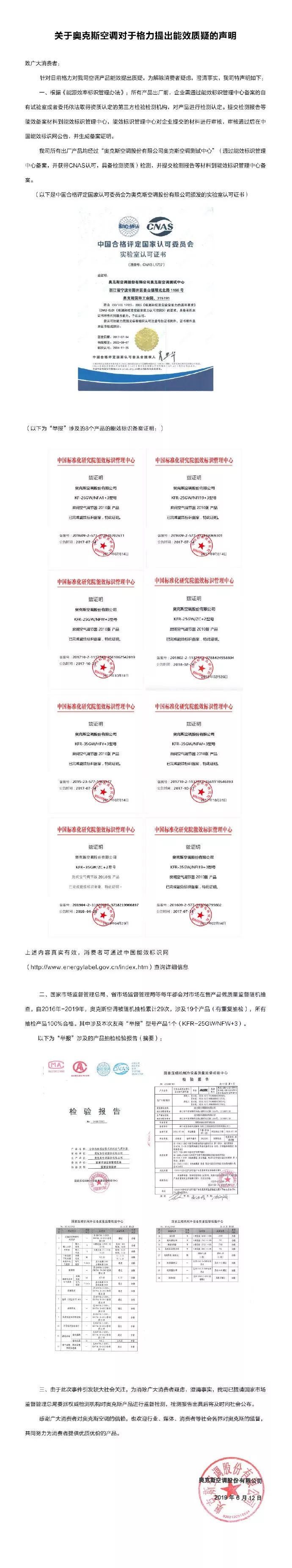 5.奥克斯回应格力质疑:已提请市场监管总局委派权威检测机构对产品进行检测