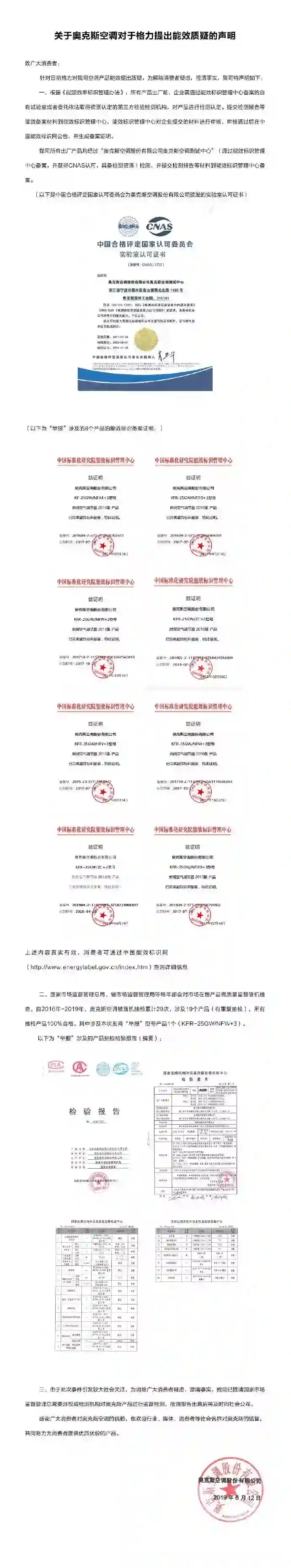 针对日前格力电器提出的质疑,奥克斯今日发布《关于奥克斯空调对于格力提出能效质疑的声明》称,我司所有出厂产品均经过检测,并提交检测报告等材料到能效标识管理中心备案。奥克斯表示:为消除广大消费者疑虑,澄清事实,我司已提请国家市场监管总局委派权威检测机构对奥克斯产品进行监督检测,检测报告出具后将及时向社会公布。