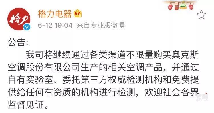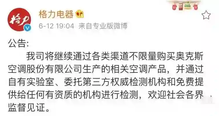 6月12日消息,格力电器发文指出,将继续通过各类渠道不限量购买奥克斯空调股份有限公司生产的相关空调产品,并通过自有实验室、委托第三方权威检测机构和免费提供给任何有资质的机构进行检测,欢迎社会各界监督见证。