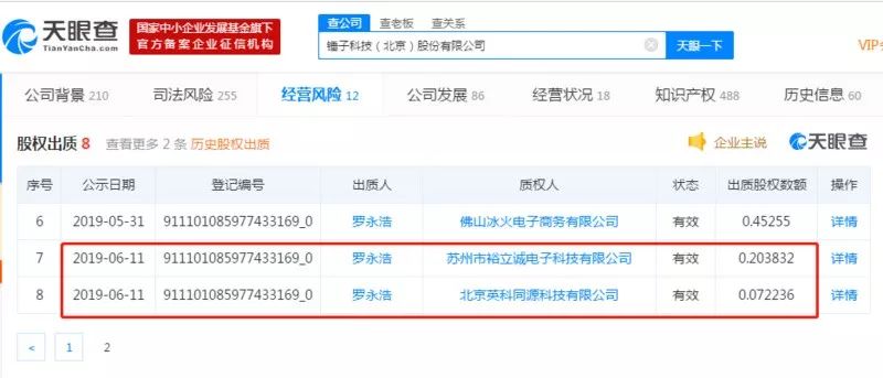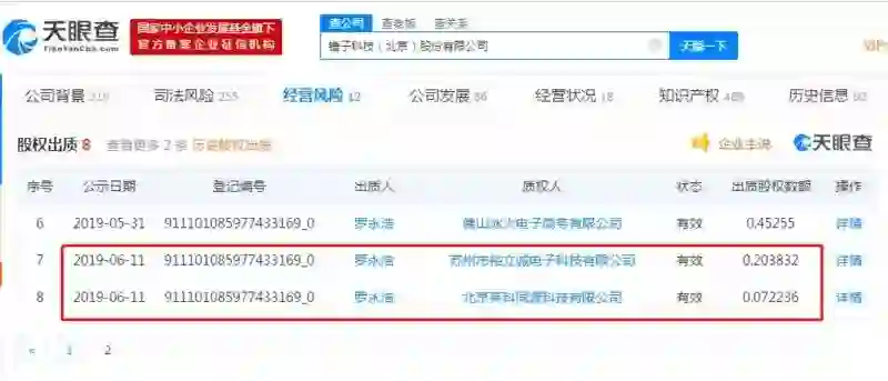 天眼查数据显示,6月11日,罗永浩出质锤子科技(北京)股份有限公司旗下股权,质权人分别为苏州市裕立诚电子科技有限公司、北京英科同源科技有限公司,出质状态均显示有效。这是罗永浩在2019年第三次转让锤子股权。此前,罗永浩已陆续将其在锤子科技所持股权出质给深圳市蓝思科技有限公司、猎豹旗下公司等。