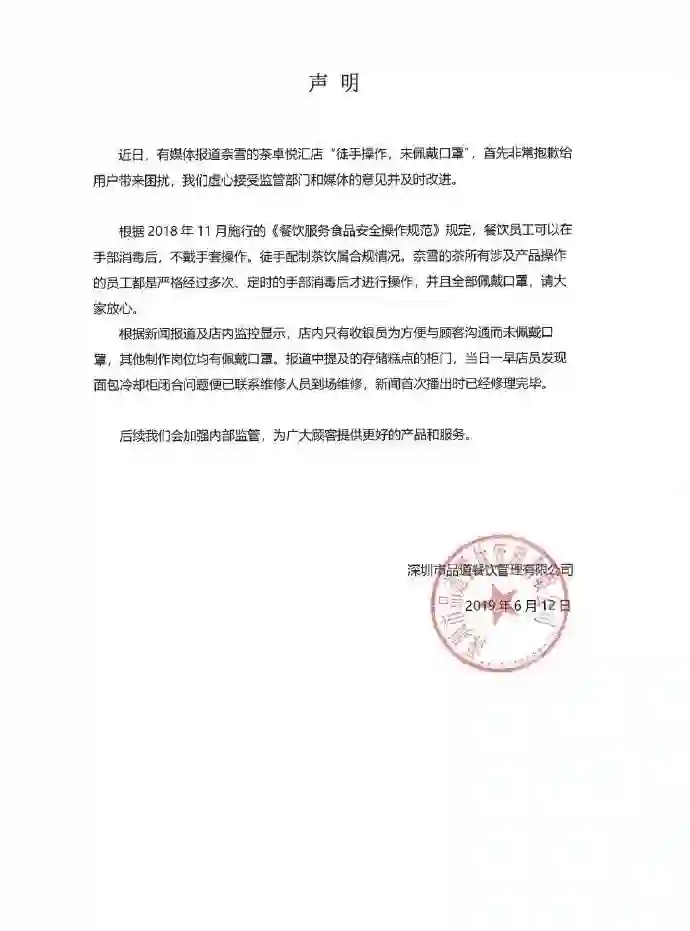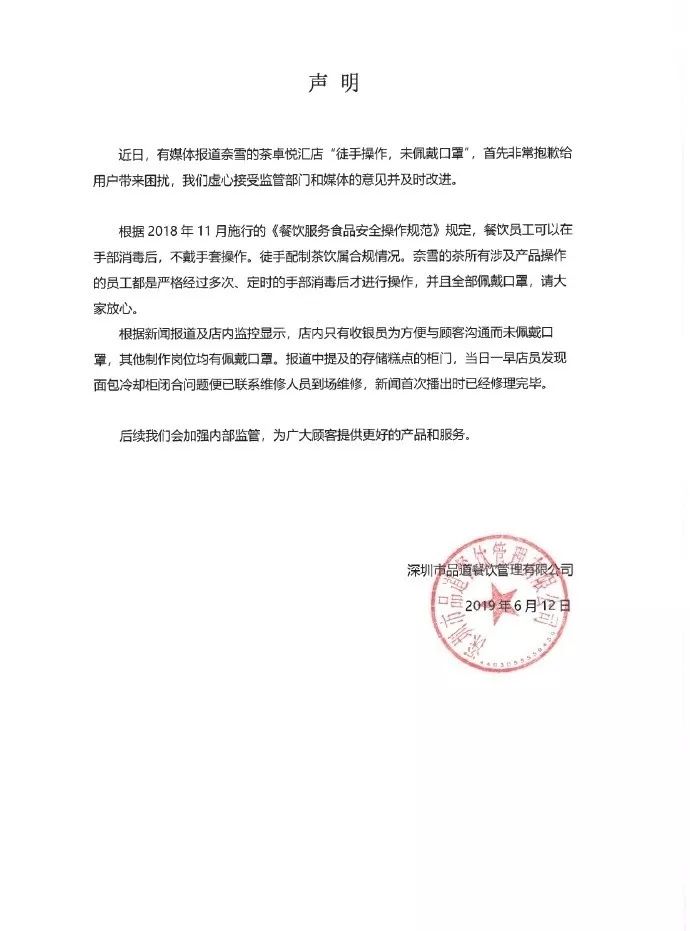 近日,有媒体报道奈雪的茶卓悦汇店“徒手操作,未佩戴口罩”,对此,奈雪的茶发布声明称,虚心接受监管部门和媒体的意见并及时改进。根据2018年11月施行的《餐饮服务食品安全操作规范》规定,餐饮员工可以在手部消毒后,不戴手套操作。徒手配制茶饮属合规情况。(北京商报)