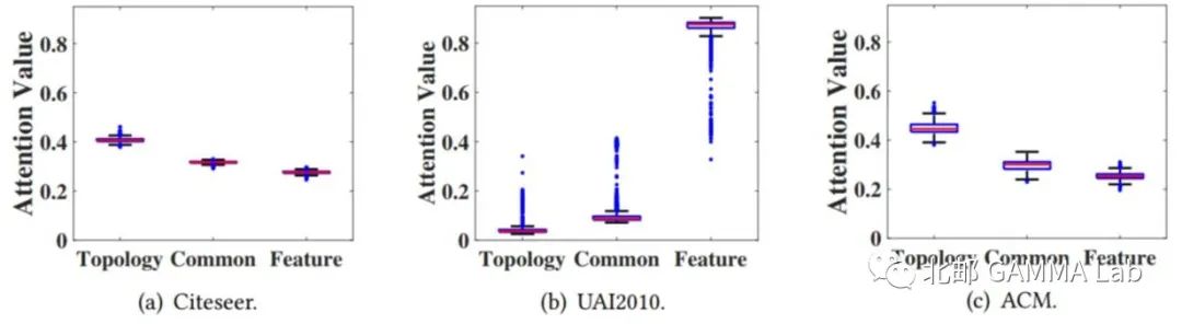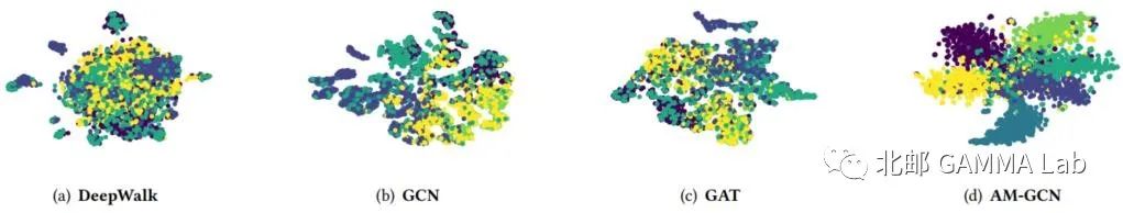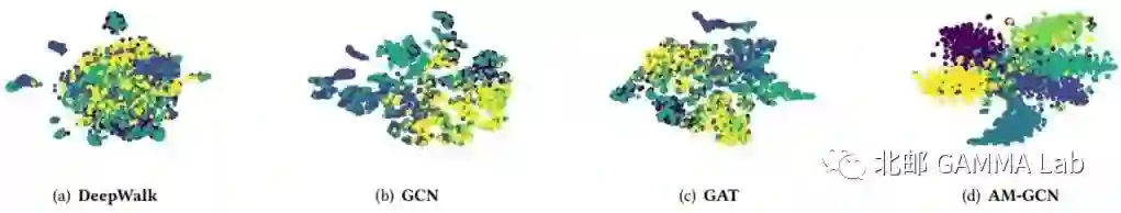 对该结果分析:DeepWalk只对此数据的网络拓扑结构进行了全面的建模。而GCN从节点特征和拓扑结构中同时提取信息,但不能自适应地根据任务进行选择融合,因此在这种情况下GCNs无法达到DeepWalk的高性能。