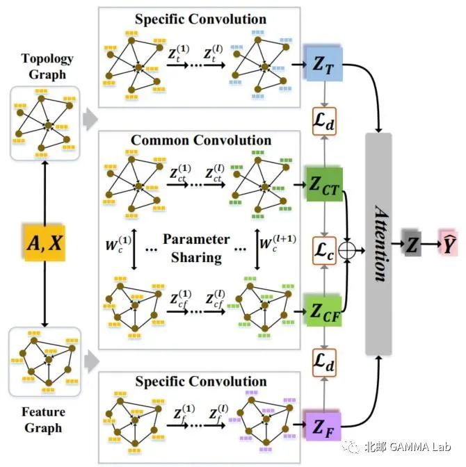 为了充分铺捉到特征空间中的结构信息,我们使用由节点特征生成的k近邻图作为特征结构图 (Feature Graph)。通过同时利用特征图 (Feature Graph) 和拓扑图 (Topology Graph),我们将节点特征传播到拓扑空间和特征空间,并利用两个特殊的图卷积模块 (Specific Convolution) 在这两个空间中提取两个特殊的嵌入。考虑到两个空间之间有存在共同特性的可能,我们设计了一个具有参数共享策略的公共图卷积模块 (Common Convolution) 来提取它们共有的嵌入。然后我们进一步利用注意机制 (Attention Mechanism) 来自动学习不同嵌入的重要性权重,从而自适应地融合它们。通过这种方式,节点标签能够监督学习过程,自适应调整权重,提取出图数据中与任务相关性最强的信息。此外,我们设计了一致性约束 (Consistency Constraint) 和差异性约束 (Disparity Constraint),以确保所学习的节点表示的一致性和差异。