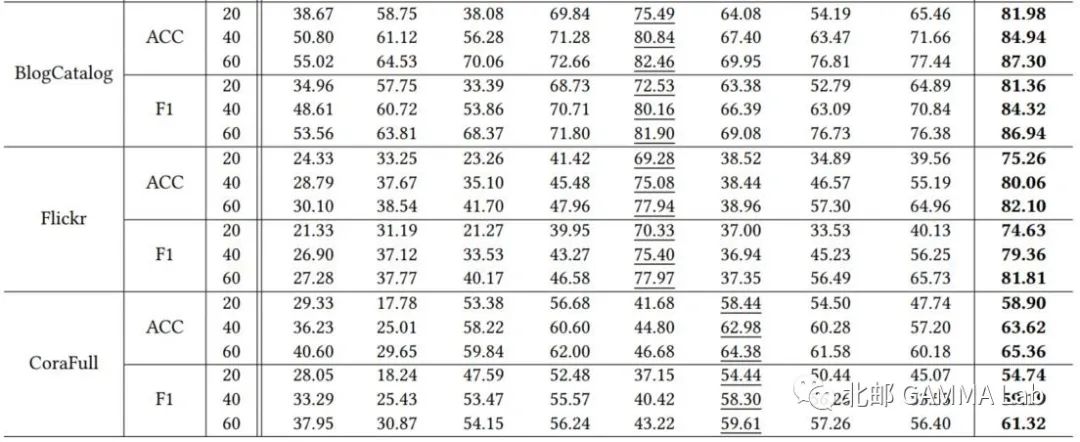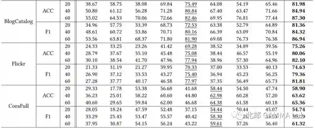 表2:节点分类实验结果。黑色加粗表示最高值,下划线表示第二高值