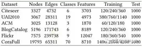 本文在六个真实数据集上分别进行了节点分类,变体分析,注意力机制分析,可视化,参数分析等实验分析。实验数据参数如下:
