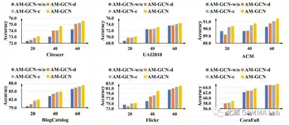 图2:AM-GCN变体(不使用约束/仅使用一致性约束/仅使用差异性约束)节点分类结果对比