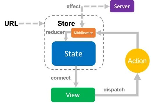 State是负责保存整个应用状态,View是React组件构成的视图层,Action是描述事件的对象。connect方法是绑定 State 到 View的函数,使得View层的组件可以动态监听State中的属性,同时可以通过dispatch方法负责将Action发送至State触发状态改变。