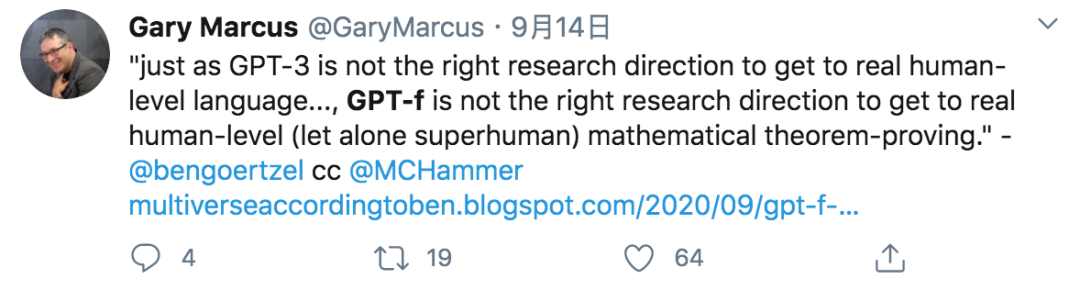 Robust.AI、Geometric Intelligence 两家 AI 公司的创始人,研究人工智能领域多年的科学家 Gary Marcus 认为,“就像 GPT-3 不是研究真正人类语言的正确方向一样……, GPT-f 并不是达到真正人类水平 (更不用说超越人了) 的数学定理证明的正确研究方向。”