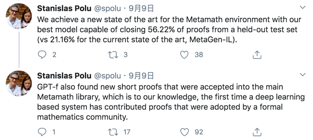 论文一作 Stanislas Polu 在推特上进行了介绍,他们在实验中发现,GPT-f 比现有自动定理证明器还要优秀,可完成测试集中 56.22% 的证明,而现有的 SOTA 模型 MetaGen-IL 也只能证明 21.16% 的定理。