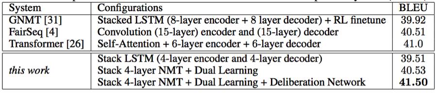 表 4:推敲网络与不同的深度 NMT 系统(英语→法语)之间的比较
