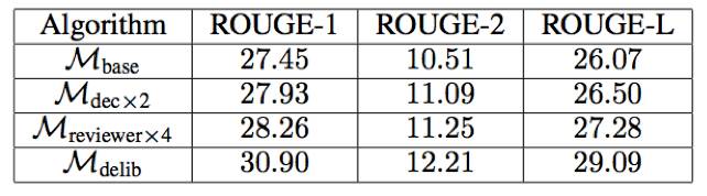 (2)文本摘要,即将长文章归纳为短摘要的任务。这个任务可以使用编码器-解码器框架,因此也可以使用推敲网络来精细处理。在 Gigaword 数据集 [6] 上的实验结果表明推敲网络可以将 ROUGE-1、ROUGE-2 和 ROUGE-L 分别提升 3.45、1.70 和 3.02。