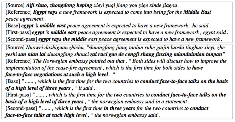 (1)神经机器翻译(NMT),即使用神经网络来将源语言的句子翻译到目标语言[1, 33, 32, 34]。标准的 NMT 模型由一个编码器(用于编码源句子)和一个解码器(用于生成目标句子)组成,因为可以使用我们提出的推敲网络加以改善。在 WMT' 14 [29] 英语→法语数据集上基于广泛应用的单层 GRU 模型[1] 上实验结果表明:相比于没有使用推敲的模型,使用推敲可以将 BLEU 分值[17]提升 1.7。我们还在汉语→英语翻译上应用了我们的模型,并且在 4 种不同的测试集上平均实现了 1.26 的 BLEU 提升。此外,在 WMT' 14 英语→法语翻译任务上,通过将推敲应用于深度 LSTM 模型,我们实现了 41.50 的 BLEU 分值,这个成绩是这一任务的全新纪录。