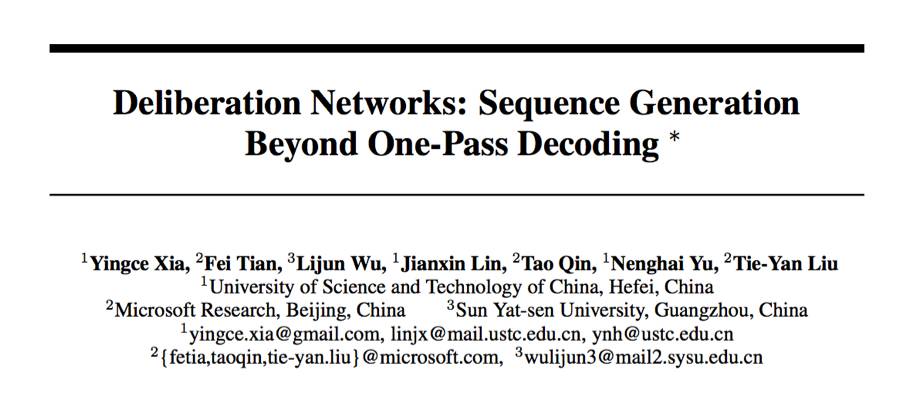 论文链接:http://papers.nips.cc/paper/6775-deliberation-networks-sequence-generation-beyond-one-pass-decoding.pdf