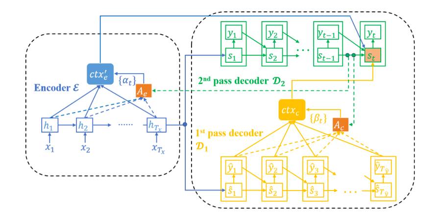 图 1:推敲网络的框架:蓝色、黄色和绿色部分分别表示编码器 E、第一阶段解码器 D1 和第二阶段解码器 D2。为了可读性,这里省略了 E 到 D1 的注意模型。