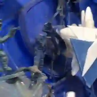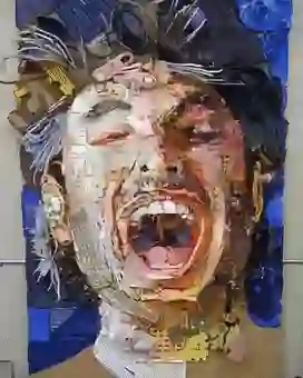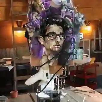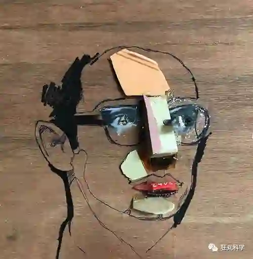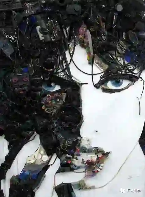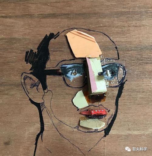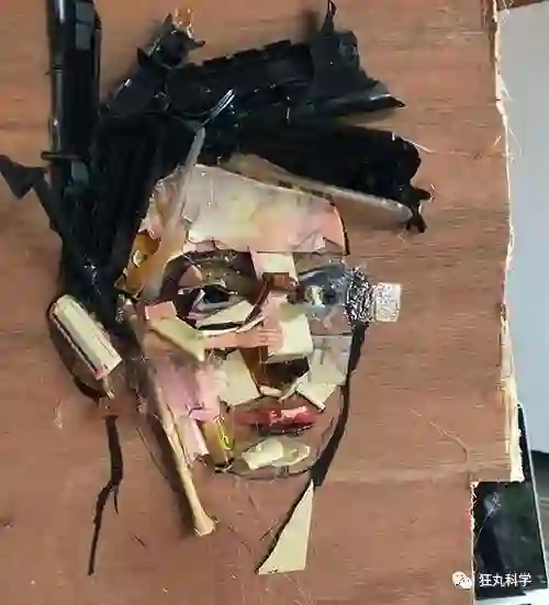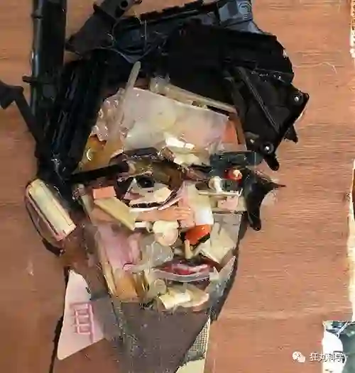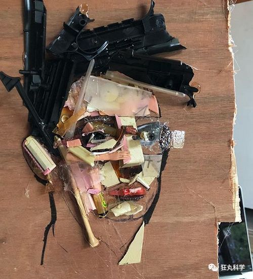 接下来就要不断填充垃圾,全程思维发散,其中杂志、玩具、娃娃、塑料垃圾都是他的最爱使用的材料。而在这幅肖像中,模特脑子中的齿轮就添加的很有意思:
