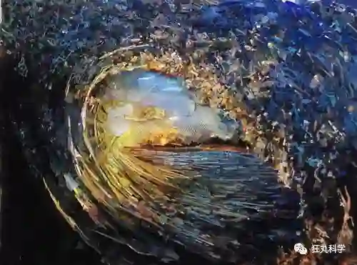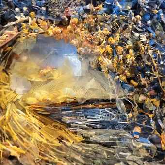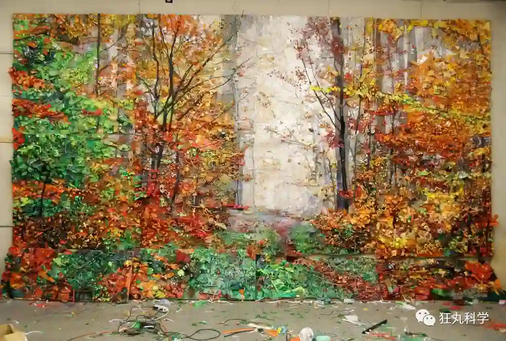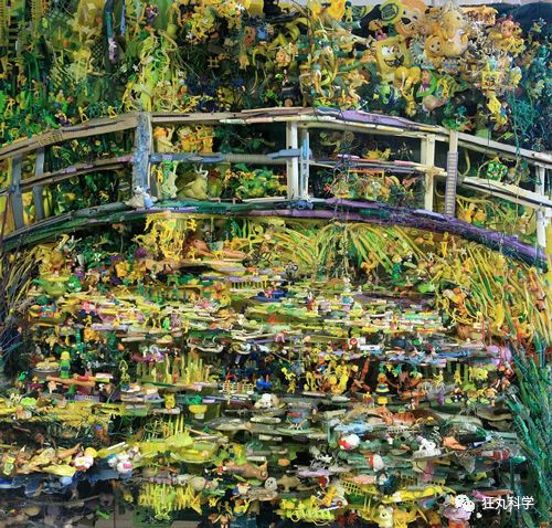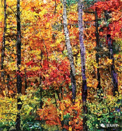 不过很明显,这位环保人士还有点恶趣味,那就是他非常善于把人们最不在乎的垃圾,做成人们最在乎的美景。利用观景时的感官反转造成的落差感,传达自己的思想。其中我最喜欢的作品之一就是这幅《海浪3》,Tom本人也是冲浪的狂热粉,而这幅作品中掀起的滔天巨浪像是要从画框中翻了出来,同时海面将阳光折射四散,颇为壮观: