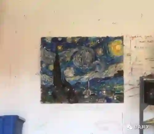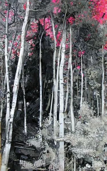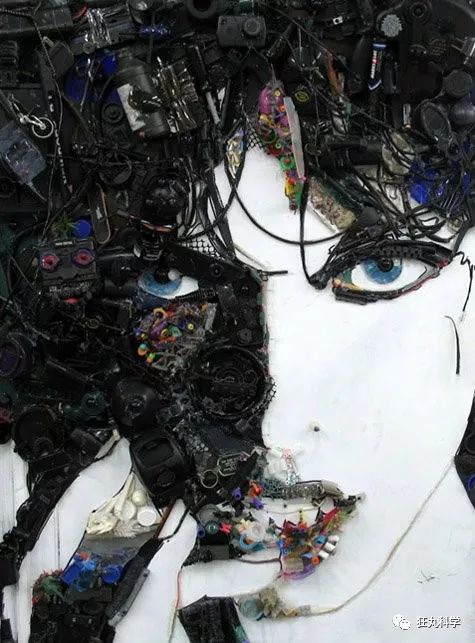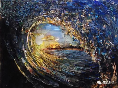 然而随着镜头距离拉近,你会发现这幅画上没有颜料也没有笔触,它的绚烂星空居然是由一堆垃圾零件组成的:
