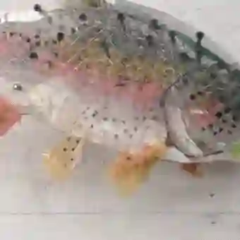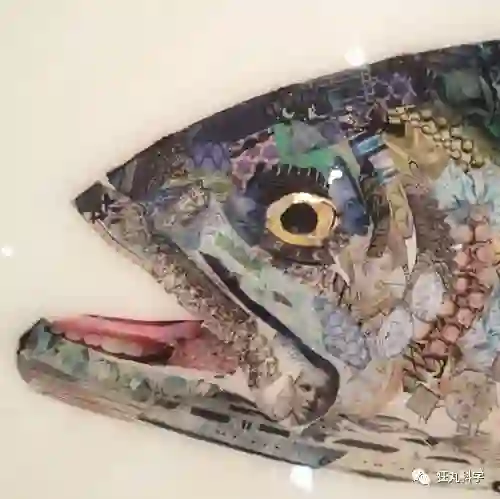 但这条鱼其实由数层构成,颜色都是一点点叠加、透视出来的,尤其是鱼头部分,第一层简直就是在塑料板上面钻了个孔: